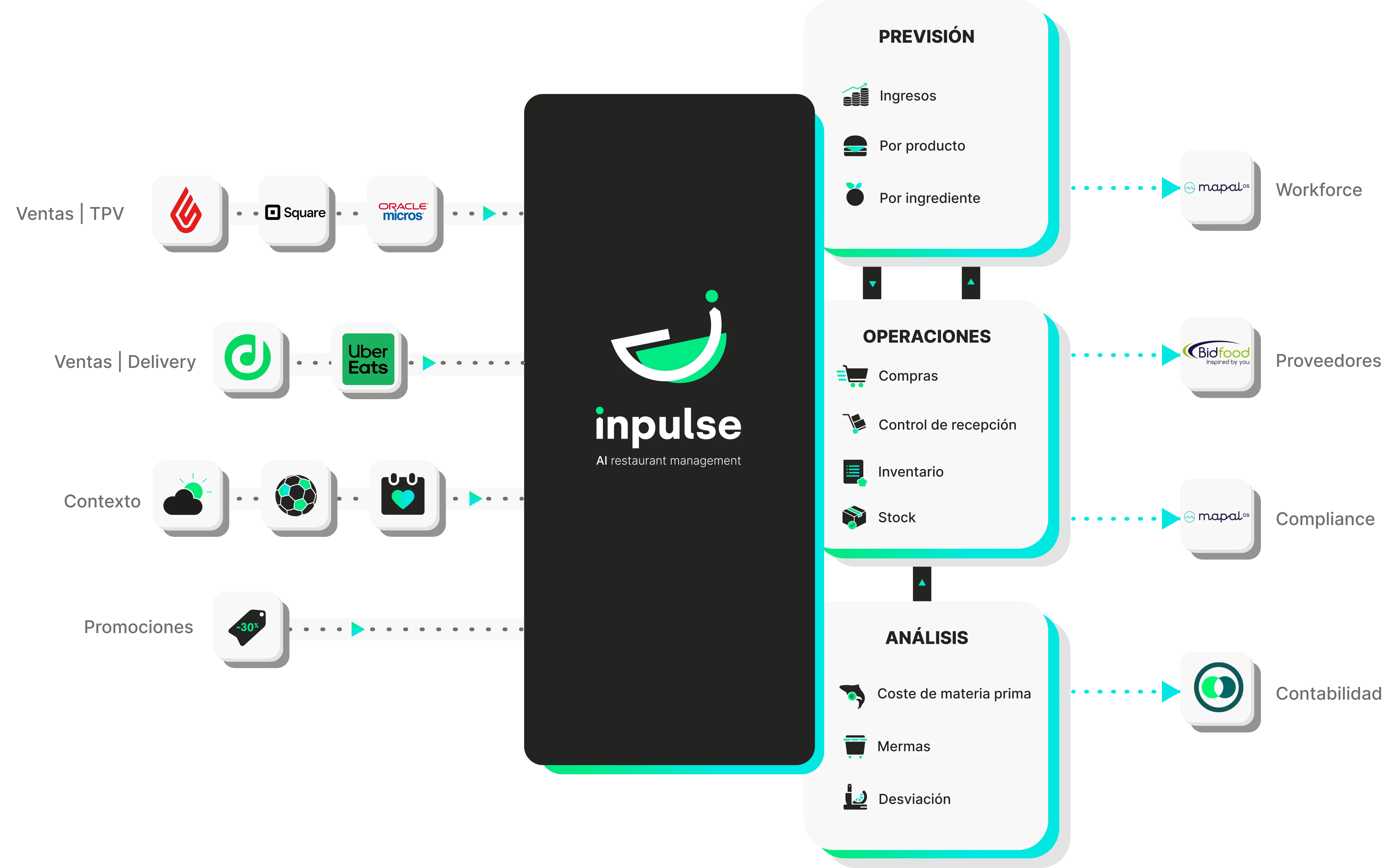 La recopilación de datos de ventas en las plataformas de entrega permite recuperar todos los datos de ventas por canal, además de los datos recopilados a través del software de caja registradora, para refinar las previsiones y recomendaciones de Inpulse.